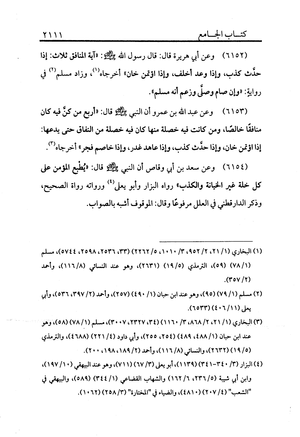 (¬1) البخاري (1/21، 2/952، 3/1010، 5/2262) (33، 2536، 2598، 5744) ، مسلم (1/78) (59) ، الترمذي (5/19) (2631) ، وهو عند النسائي (8/116) ، وأحمد (2/357) .