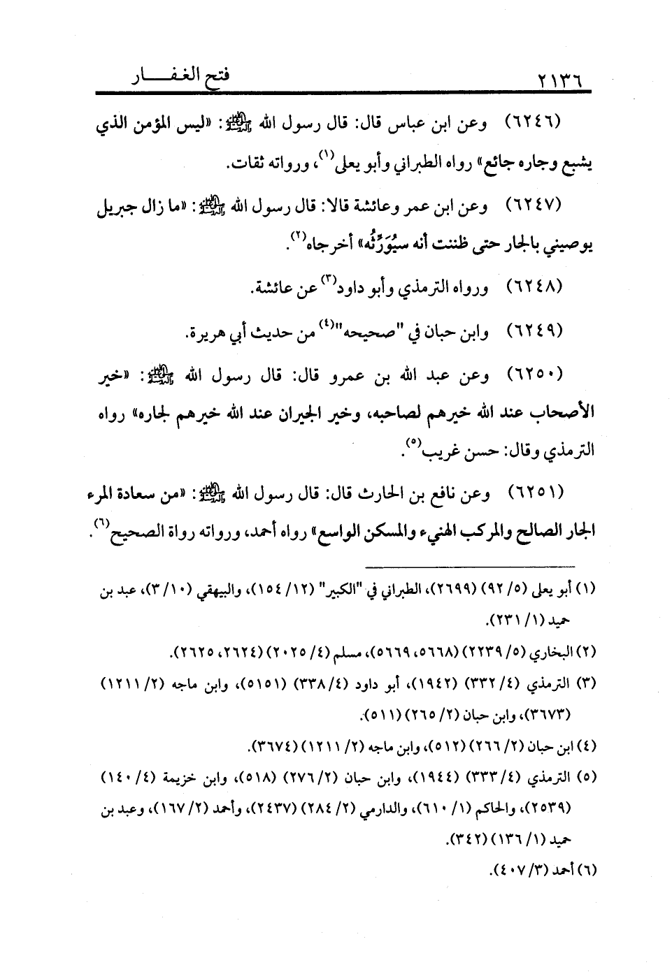 6246 - وعن ابن عباس قال: قال رسول الله - صلى الله عليه وسلم -: «ليس المؤمن الذي يشبع وجاره جائع» رواه الطبراني وأبو يعلى (¬1) ورواته ثقات.