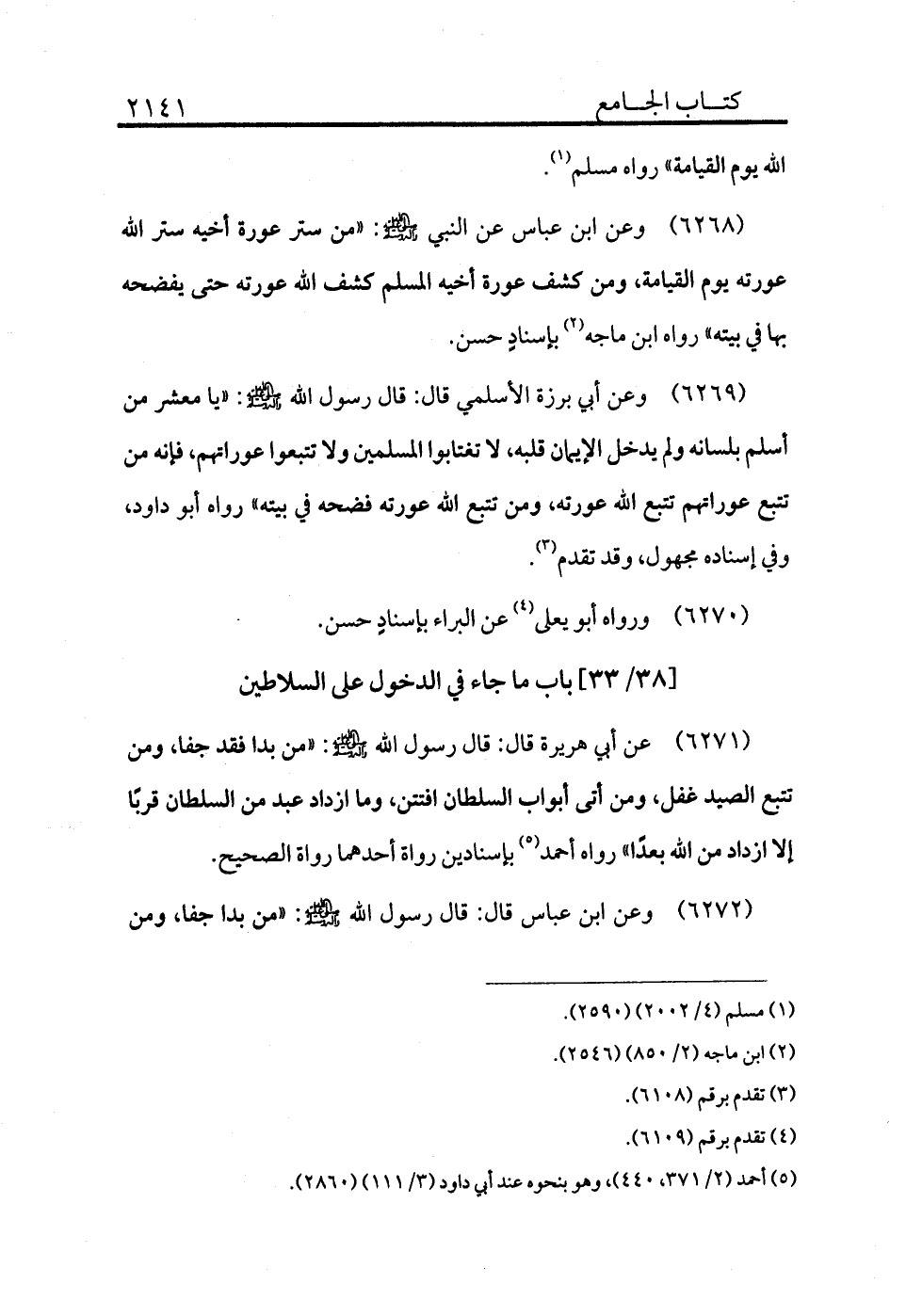 6271 - عن أبي هريرة قال: قال رسول الله - صلى الله عليه وسلم -: «من بدا فقد جفا، ومن تتبع الصيد غفل، ومن أتى أبواب السلطان افتتن، وما ازداد عبد من السلطان قربًا إلا ازداد من الله بعدًا» رواه أحمد (¬5) بإسنادين رواة أحدهما رواة الصحيح.