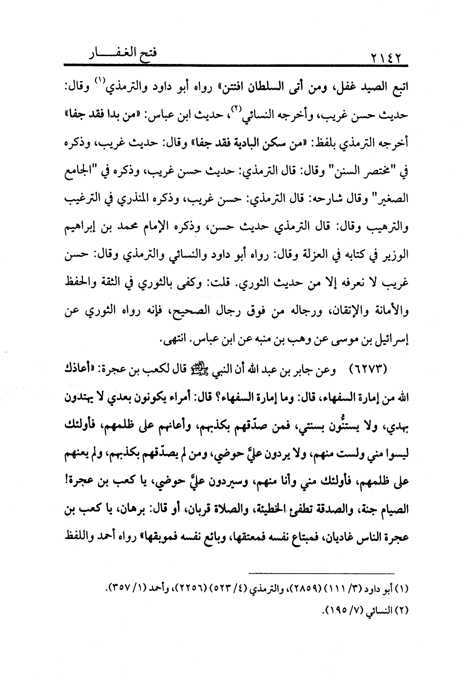 اتبع الصيد غفل، ومن أتى السلطان افتتن» رواه أبو داود والترمذي (¬1) ، وقال: حديث حسن غريب. وأخرجه النسائي (¬2) ، حديث ابن عباس: «من بدا فقد جفا» أخرجه الترمذي بلفظ: «من سكن البادية فقد جفا» وقال حديث غريب، وذكره في "مختصر السنن"، وقال: قال الترمذي: حديث حسن غريب وذكره في "الجامع الصغير" وقال شارحه: قال الترمذي: حسن غريب وذكره المنذري في الترغيب والترهيب، وقال: قال الترمذي حديث حسن، وذكره الإمام محمد بن إبراهيم الوزير في كتابه في العزلة، وقال رواه أبو داود والنسائي والترمذي، وقال: حسن غريب لا نعرفه إلا من حديث الثوري. قلت: وكفى بالثوري في الثقة والحفظ والأمانة والإتقان، ورجاله من فوق رجال الصحيح، فإنه رواه الثوري عن إسرائيل بن موسى عن وهب بن منبه عن ابن عباس. انتهى.