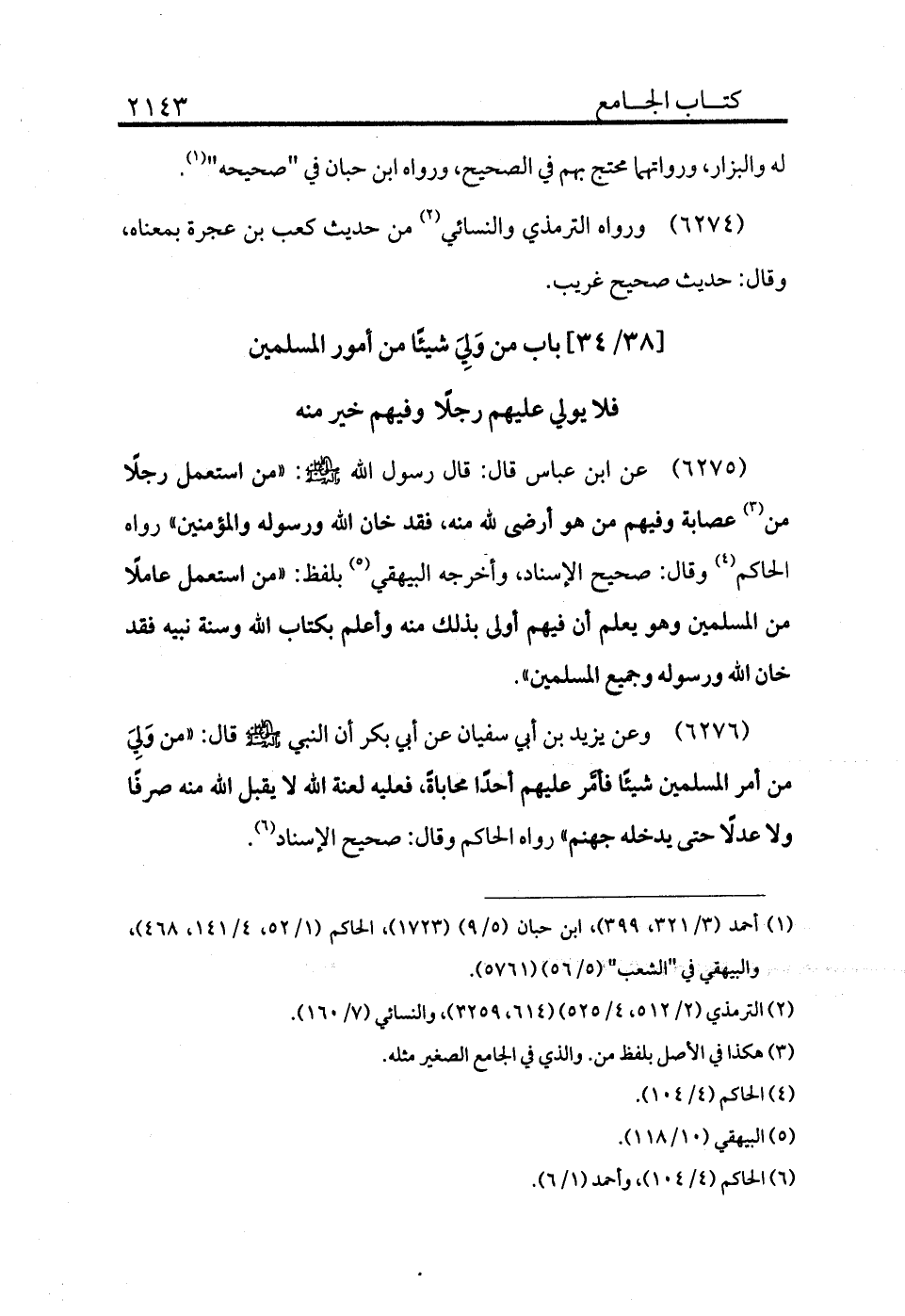 6276 - وعن يزيد بن أبي سفيان عن أبي بكر أن النبي - صلى الله عليه وسلم - قال: «من ولي من أمر المسلمين شيئًا فأمر عليهم أحدًا محاباة فعليه لعنة الله لا يقبل الله منه صرفًا ولا عدلًا حتى يدخله جهنم» رواه الحاكم وقال: صحيح الإسناد (¬6) .