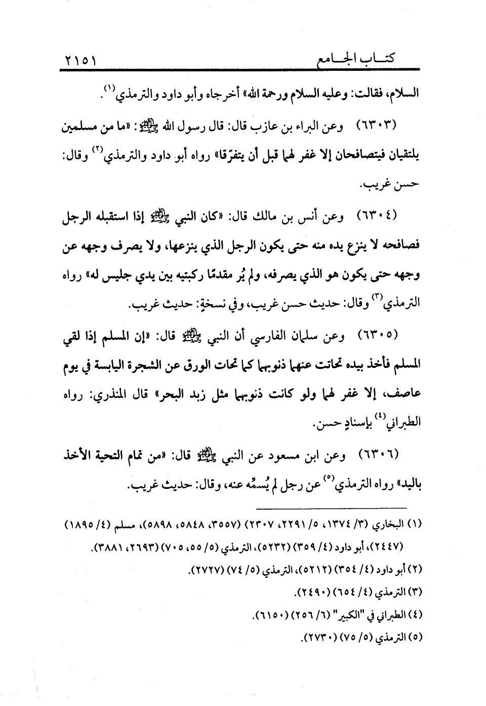 6303 - وعن البراء بن عازب قال: قال رسول الله - صلى الله عليه وسلم -: «ما من مسلمين يلتقيان فيتصافحان إلا غفر لهما قبل أن يفترقا» رواه أبو داود والترمذي (¬2) ، وقال: حسن غريب.