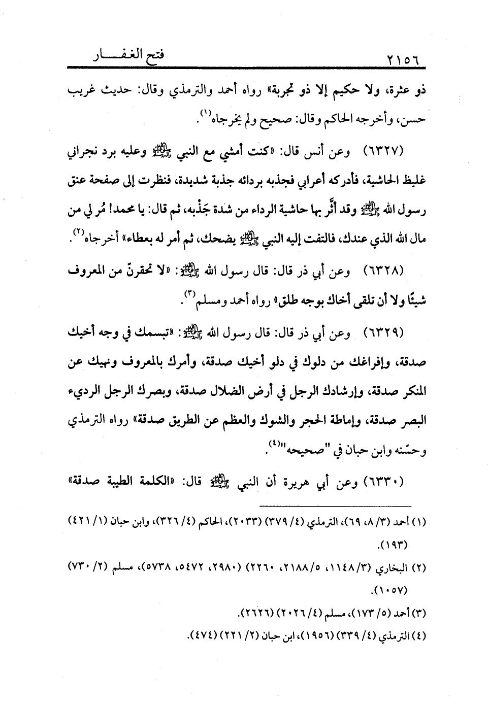 6329 - وعن أبي ذر قال: قال رسول الله - صلى الله عليه وسلم -: «تبسمك في وجه أخيك صدقة، وإفراغك من دلوك في دلو أخيك صدقة، وأمرك بالمعروف ونهيك عن المنكر صدقة، وإرشادك الرجل في أرض الضلال صدقة، وبصرك الرجل الردي البصر صدقة، وإماطة الحجر والشوك والعظم عن الطريق صدقة» رواه الترمذي وحسنه ابن حبان في "صحيحه" (¬4) .