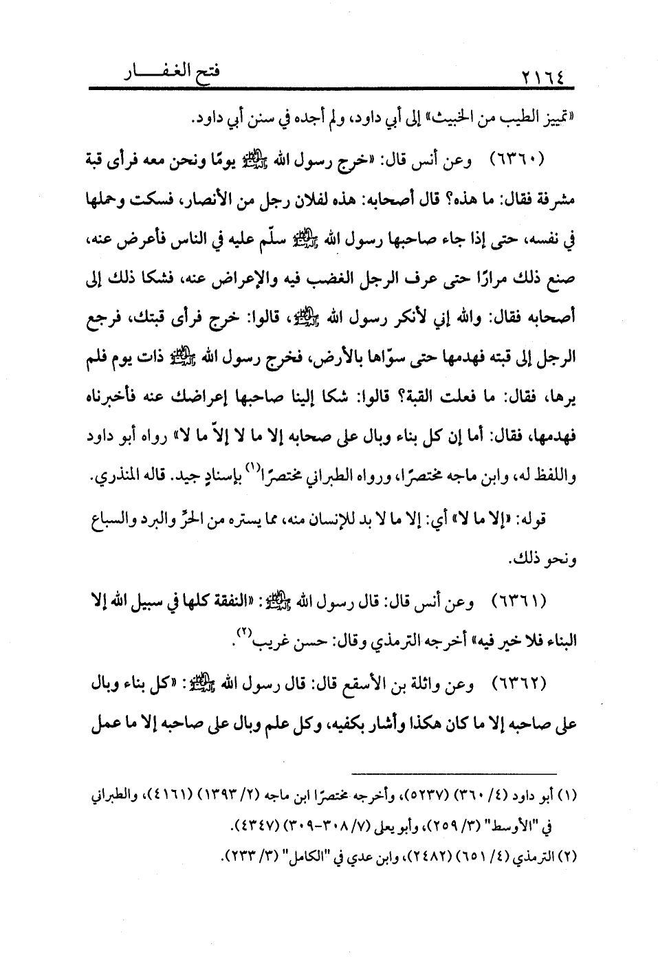 6360 - وعن أنس قال: «خرج رسول الله - صلى الله عليه وسلم - يومًا ونحن معه فرأى قبة مشرقة فقال: ما هذه؟ قال أصحابه: هذه لفلان رجل من الأنصار، فسكت وحملها في نفسه حتى إذا جاء صاحبها رسول الله - صلى الله عليه وسلم - سلم عليه في الناس فأعرض عنه صنع ذلك مرارًا حتى عرف الرجل الغضب فيه والإعراض عنه فشكا ذلك إلى أصحابه فقال: والله إني لأنكر رسول الله - صلى الله عليه وسلم - قالوا: خرج فرأى قبتك، فرجع الرجل إلى قبته فهدمها حتى سواها بالأرض فخرج رسول الله - صلى الله عليه وسلم - ذات يوم فلم يرها، فقال: ما فعلت القبة، قالوا: شكا إلينا صاحبها إعراضك عنه فأخبرناه فهدمها، فقال: أما إن كل بناء وبال على صحابه إلا مالًا إلا مالًا» رواه أبو داود واللفظ له وابن ماجة مختصرًا ورواه الطبراني مختصرًا (¬1) بإسناد جيد.
