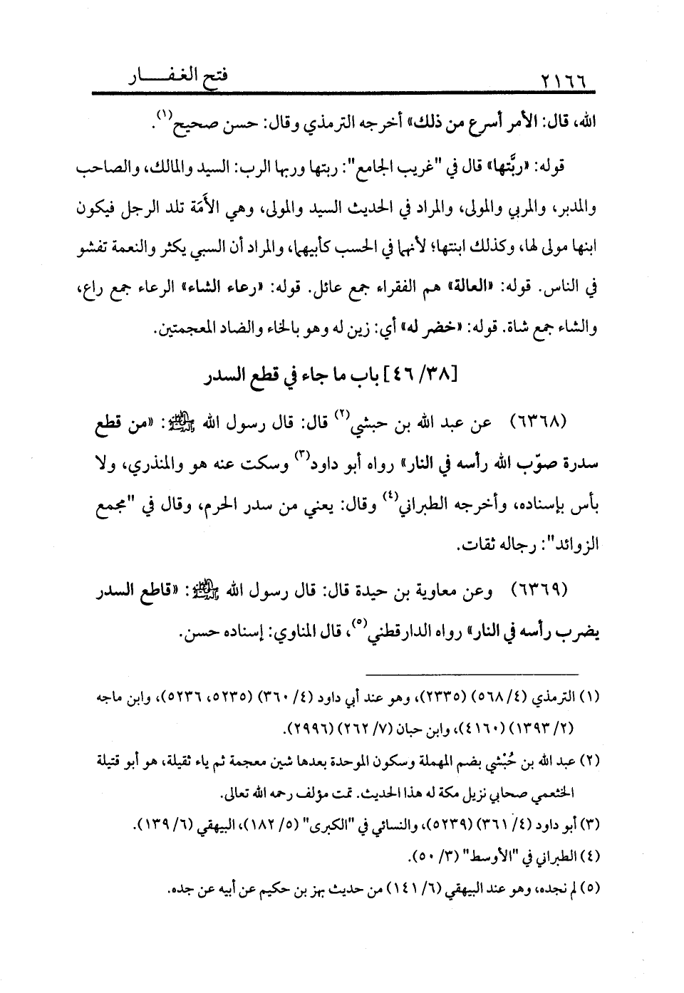 6369 - وعن معاوية بن حيدة قال: قال رسول الله - صلى الله عليه وسلم -: «قاطع السدر يضرب رأسه في النار» رواه الدارقطني (¬5) ، قال المناوي: إسناده حسن.
