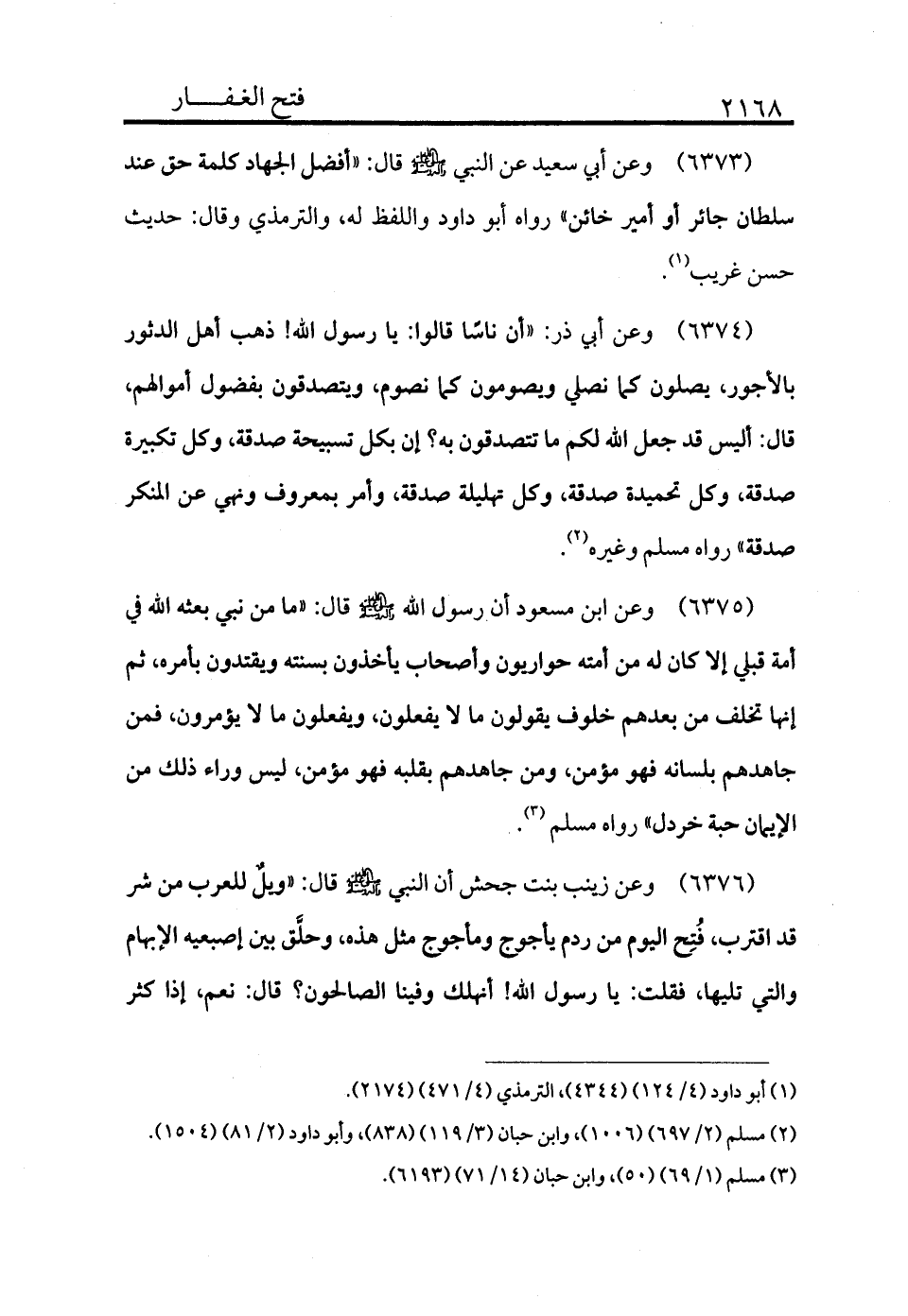 6374 - وعن أبي ذر «أن ناسًا قالوا: يا رسول الله! ذهب أهل الدثور بالأجور، يصلون كما نصلي ويصومون كما نصوم، ويتصدقون بفضول أموالهم، قال: أليس قد جعل الله لكم ما تتصدقون به إن بكل تسبيحة صدقة، وكل تكبيرة صدقة، وكل تحميدة صدقة، وكل تهليلة صدقة، وأمر بمعروف ونهي عن المنكر صدقة» رواه مسلم وغيره (¬2) .
