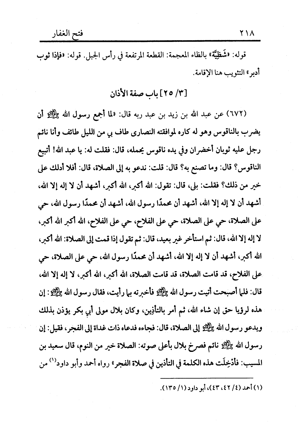 672 - عن عبد الله بن زيد بن عبد ربه قال: «لما أجمع رسول الله - صلى الله عليه وسلم - أن يضرب بالناقوس وهو له كاره لموافقته النصارى طاف بي من الليل طائف وأنا نائم رجل عليه ثوبان أخضران وفي يده ناقوس يحمله، قال: فقلت له: يا عبد الله! أتبيع الناقوس؟ قال: وما تصنع به؟ قال: قلت: ندعو به إلى الصلاة، قال: أفلا أدلك على خير من ذلك؟ فقلت: بلى، قال: تقول: الله أكبر، الله أكبر، أشهد أن لا إله إلا الله، أشهد أن لا إله إلا الله، أشهد أن محمدًا رسول الله، أشهد أن محمدًا رسول الله، حي على الصلاة، حي على الصلاة، حي على الفلاح، حي على الفلاح، الله أكبر الله أكبر، لا إله إلا الله، ثم استأخر غير بعيد، قال: ثم تقول إذا قمت للصلاة: الله أكبر، الله أكبر، أشهد أن لا إله إلا الله، أشهد أن محمدًا رسول الله، حي على الصلاة، حي على الفلاح، قد قامت الصلاة، قد قامت الصلاة، الله أكبر، الله أكبر، لا إله إلا الله، قال: فلما أصبحت أتيت رسول الله - صلى الله عليه وسلم - فأخبرته بما رأيت، فقال: رسول الله - صلى الله عليه وسلم -: إن هذه لرؤيا حق إن شاء الله، ثم أمر بالتأذِين، وكان بلال مولى أبي بكر يؤذن بذلك ويدعو رسول الله - صلى الله عليه وسلم - إلى الصلاة، قال: فجاءه فدعاه ذات غداة إلى الفجر، فقيل: إن رسول الله - صلى الله عليه وسلم - نائم فصرخ بلال بأعلى صوته: الصلاة خير من النوم، قال سعيد بن المسيب: فأدخلت هذه الكلمة في التأذين في صلاة الفجر» رواه أحمد وأبو داود (¬1)