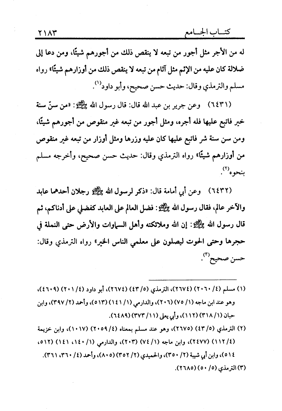 (¬2) الترمذي (5/43) (2675) ، وهو عند مسلم بمعناه (4/2059) (1017) ، وابن خزيمة (4/112) (2477) ، وابن ماجه (1/74) (203) ، والدارمي (1/140، 141) (512، 514) ، وابن أبي شيبة (2/350) ، والحميدي (2/352) (805) ، وأحمد (4/360، 361) .