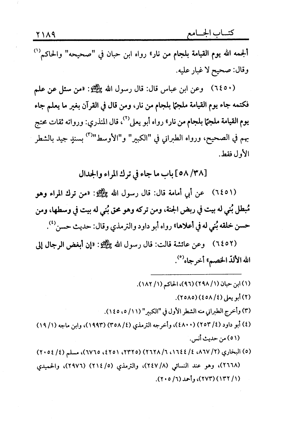 ألجمه الله يوم القيامة بلجام من نار» رواه ابن حبان في "صحيحه" والحاكم (¬1) ، وقال: صحيح لا غبار عليه.