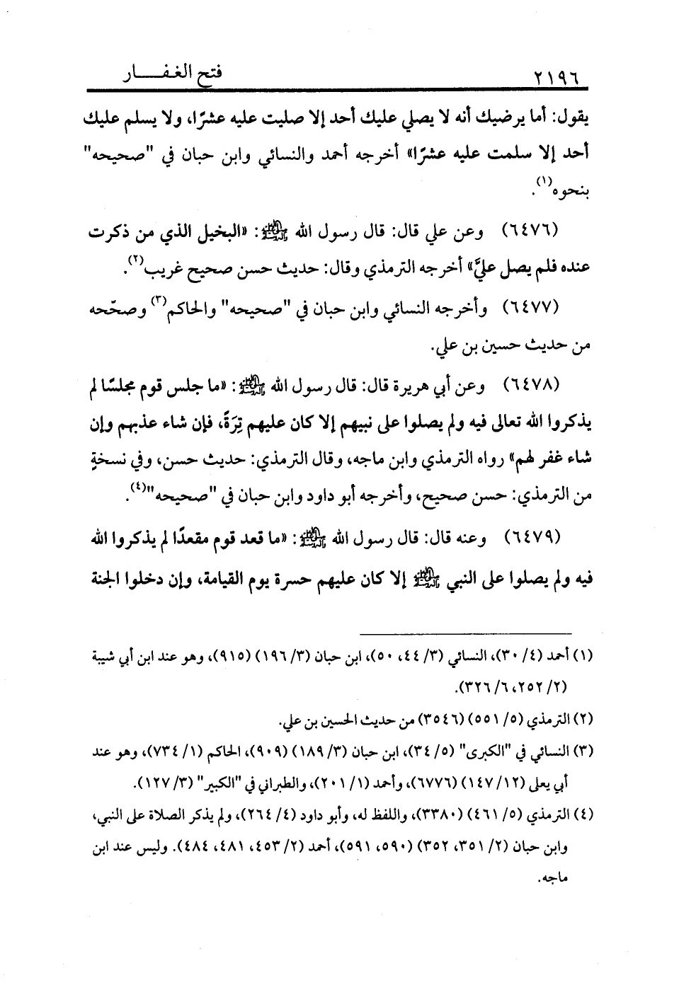 6476 - وعن علي رضي الله عنه، قال: قال رسول الله - صلى الله عليه وسلم -: «البخيل الذي ذكرت عنده فلم يصل عليَّ» أخرجه الترمذي وقال: حديث حسن صحيح غريب (¬2) .