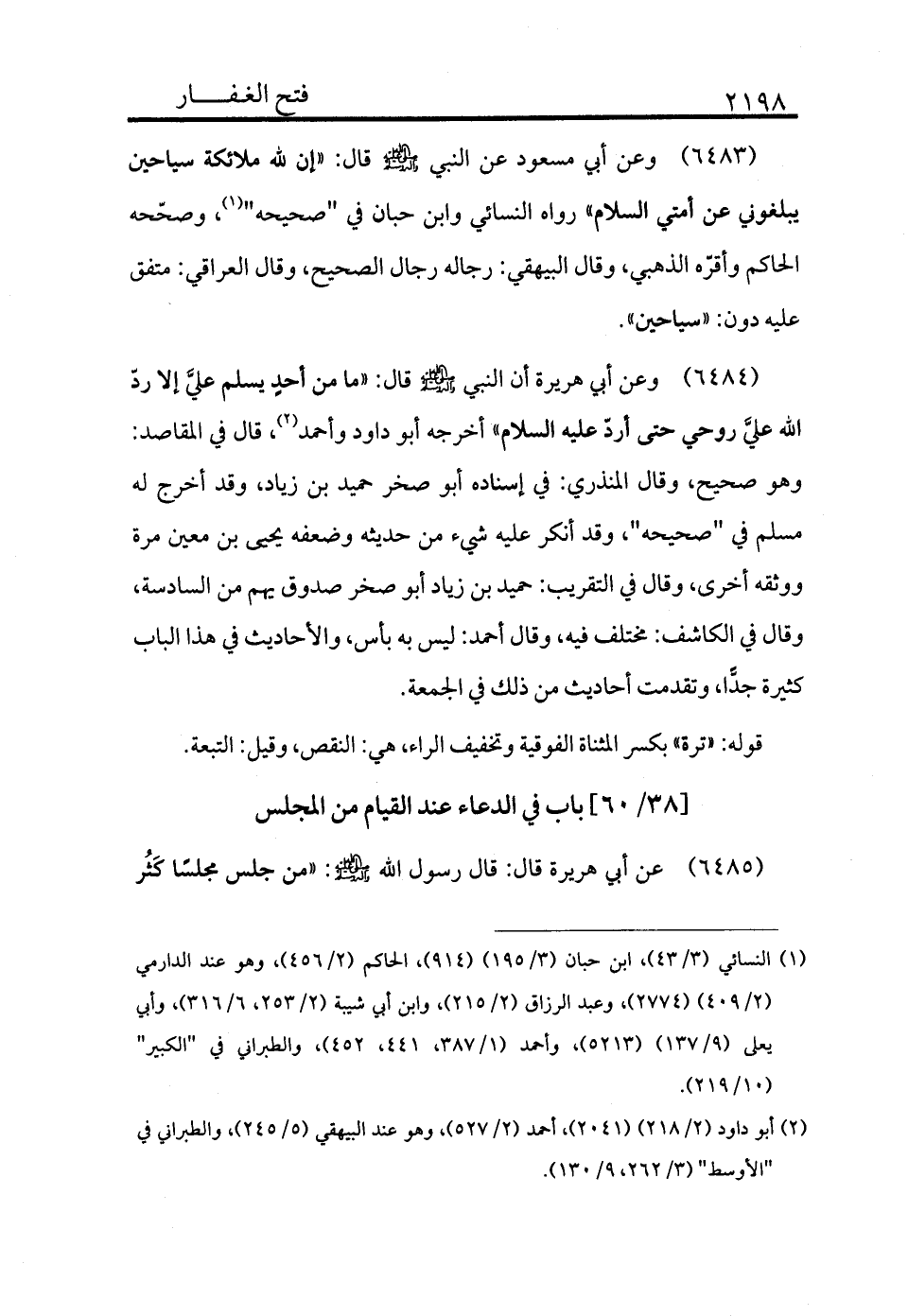 6483 - وعن أبي مسعود عن النبي - صلى الله عليه وسلم - قال: «إن لله ملائكة سياحين يبلغوني عن أمتي السلام» رواه النسائي وابن حبان في "صحيحه" (¬1) ، وصححه الحاكم وأقره الذهبي، وقال البيهقي رجاله رجال الصحيح، وقال العراقي: متفق عليهما دون «سياحين» .