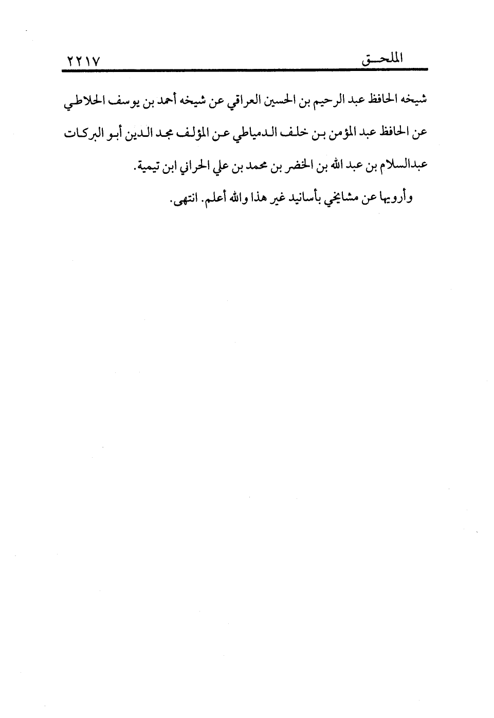 شيخه الحافظ عبد الرحيم بن الحسين العراقي عن شيخه أحمد بن يوسف الحلاطي عن الحافظ عبد المؤمن بن خلف الدمياطي عن المؤلف مجد الدين أبو البركات عبد السلام بن عبد الله بن الخضر بن محمد بن علي الحراني بن تيمية.