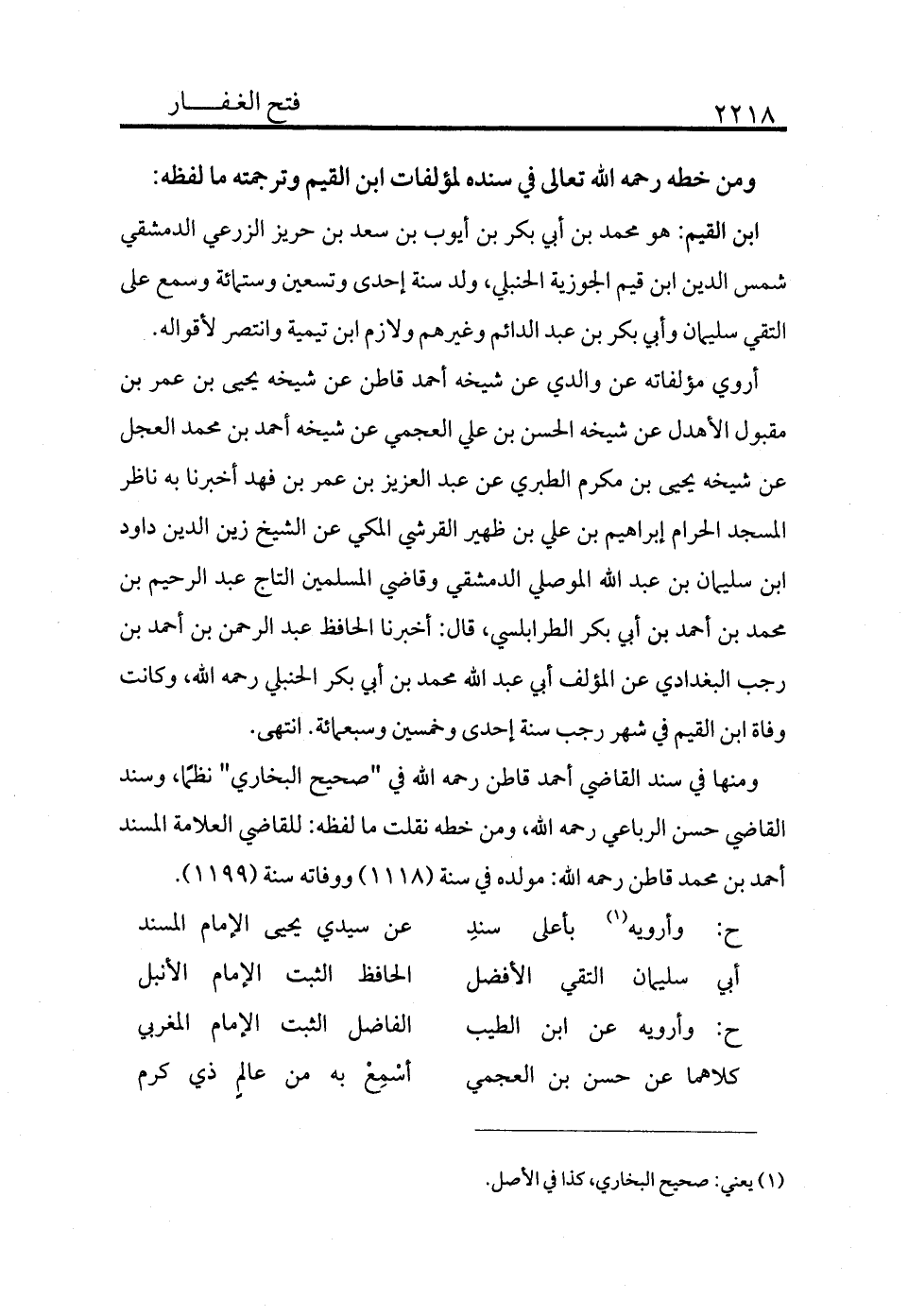 أروي مؤلفاته عن والدي عن شيخه أحمد قاطن عن شيخه يحيى بن عمر بن مقبول الأهدل عن شيخه الحسن بن علي العجمي عن شيخه أحمد بن محمد العجل عن شيخه يحيى بن مكرم الطبري عن عبد العزيز بن عمر بن فهد أخبرنا به ناظر المسجد الحرام إبراهيم بن علي بن ظهير القرشي المكي عن الشيخ زين الدين داود بن سليمان بن عبد الله الموصلي الدمشقي وقاضي المسلمين التاج عبد الرحيم بن محمد بن أحمد بن أبي بكر الطرابلسي، قال أخبرنا الحافظ عبد الرحمن بن أحمد بن رجب البغدادي عن المؤلف أبي عبد الله محمد بن أبي بكر الحنبلي رحمه الله، وكانت وفاة ابن القيم في شهر رجب سنة إحدى وخمسين وسبعمائة. انتهى