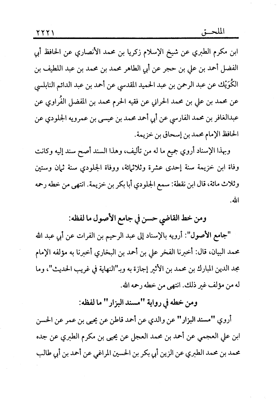 بن مكرم الطبري عن شيخ الإسلام زكريا بن محمد الأنصاري عن الحافظ أبي الفضل أحمد بن علي بن حجر عن أبي الطاهر محمد بن محمد بن عبد اللطيف بن الكولك عن عبد الرحمن بن عبد الحميد المقدسي عن أحمد بن عبد الدائم النابلسي عن محمد بن علي بن محمد الحراني عن فقيه الحرم محمد بن المفضل الفراوي عن عبد الغافر بن محمد الفارسي عن أبي أحمد محمد بن عيسى بن عمرويه الجلودي عن الحافظ الإمام محمد بن إسحاق بن خزيمة.