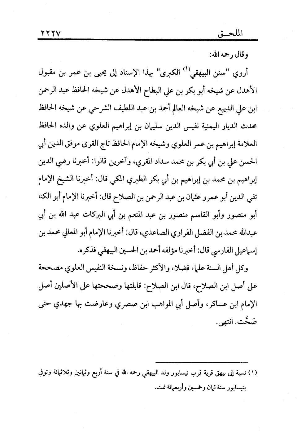 أروي سنن البيهقي (¬1) الكبرى بهذا الإسناد إلى يحيى بن عمر بن مقبول الأهدل عن شيخه أبو بكر بن علي البطاح الأهدل عن شيخه الحافظ عبد الرحمن بن علي الديبع عن شيخه العالم أحمد بن عبد اللطيف الشرحي عن شيخه الحافظ محدث الديار اليمنية نفيس الدين سليمان بن إبراهيم العلوي عن والده الحافظ العلامة إبراهيم بن عمر العلوي وشيخه الإمام الحافظ تاج القرى موفق الدين أبي الحسن علي بن أبي بكر بن محمد سداد المقري، وآخرين قالوا: أخبرنا رضي الدين إبراهيم بن محمد بن إبراهيم بن أبي بكر الطبري المكي قال: أخبرنا الشيخ الإمام تقي الدين أبو عمر عثمان بن عبد الرحمن بن الصلاح قال: أخبرنا الإمام أبو الكنا أبو منصور وأبو القاسم منصور بن عبد المنعم بن أبي البركات عبد الله بن أبي عبد الله محمد بن الفضل الفراوي الصاعدي، قال: أخبرنا الإمام أبو المعالي محمد بن إسماعيل الفارسي قال: أخبرنا مؤلفه أحمد بن الحسين البيهقي فذكره وكل أهل السنة علماء فضلاء والأكثر حفاظ ونسخة النفيس العلوي مصححه هي أصل ابن الصلاح قال ابن الصلاح: قابلتها وصححتها على الأصلين أصل الإمام ابن عساكر، وأصل أبي المواهب ابن صصري وعارضت بها جهدي حتى صحت. انتهى.