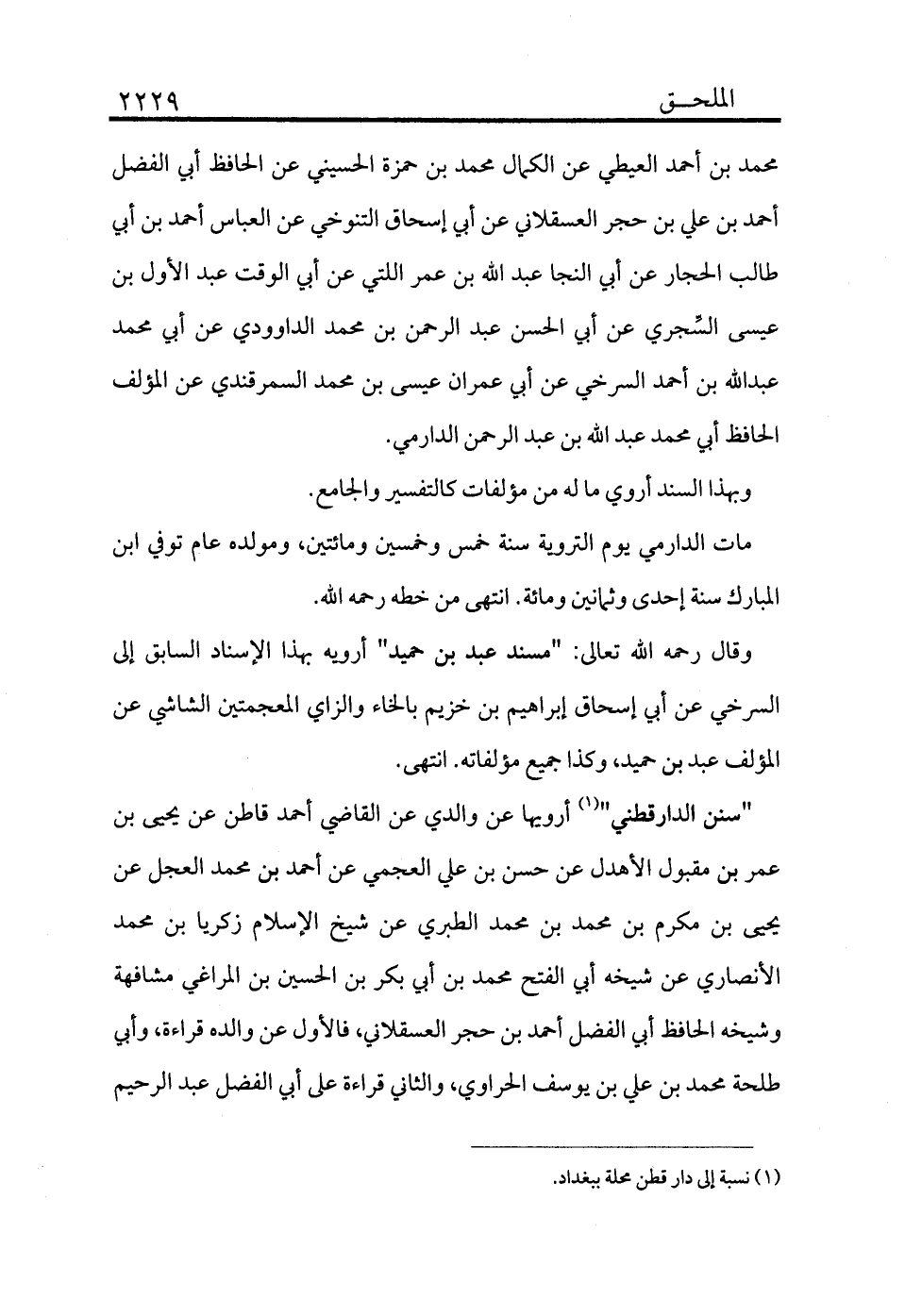 سنن الدارقطني (¬1) أرويها عن والدي عن القاضي أحمد قاطن عن يحيى بن عمر بن مقبول الأهدل عن حسن بن علي العجمي عن أحمد بن محمد العجل عن يحيى بن مكة بن محمد بن محمد الطبري عن شيخ الإسلام زكريا بن محمد الأنصاري عن شيخه أبي الفتح محمد بن أبي بكر بن الحسين بن الراعي مشافهة وشيخه الحافظ أبي الفضل أحمد بن حجر العسقلاني، فالأول عن والده قراءة، وأبي طلحة محمد بن علي بن يوسف الحراوي، والثاني قراءة علي أبي الفضل عبد الرحيم