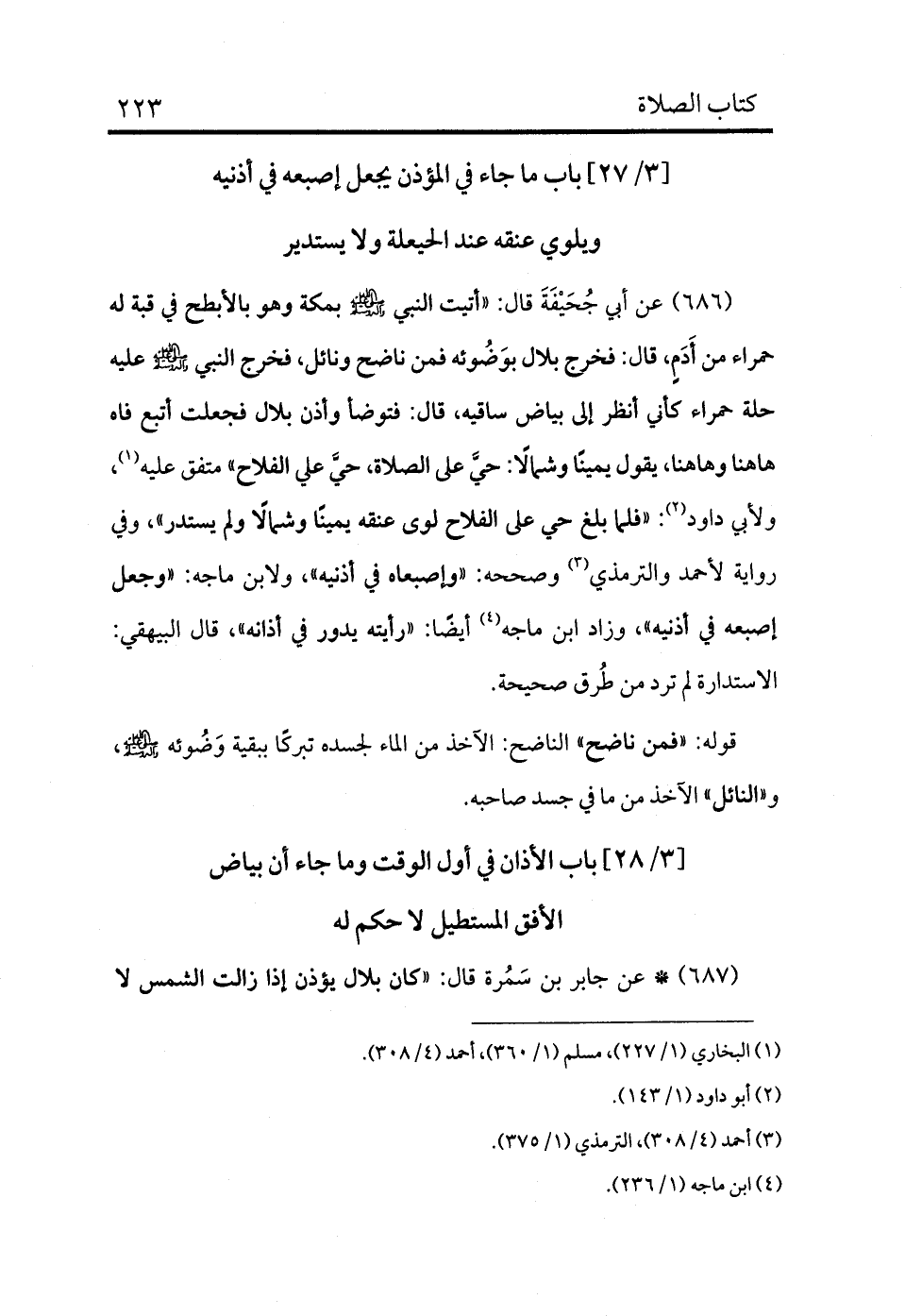 686 - عن أبي جُحَيْفَةَ قال: «أتيت النبي - صلى الله عليه وسلم - بمكة وهو بالأبطح في قبة له حمراء من أَدَمٍ، قال: فخرج بلال بوَضُوئه فمن ناضح ونائل، فخرج النبي - صلى الله عليه وسلم - عليه حلة حمراء كأني أنظر إلى بياض ساقيه، قال: فتوضأ وأذن بلال فجعلت أتبع فاه هاهنا وهاهنا، يقول يمينًا وشمالًا: حيَّ على الصلاة، حيَّ علي الفلاح» متفق عليه (¬1) ، ولأبي داود (¬2) : «فلما بلغ حي على الفلاح لوى عنقه يمينًا وشمالًا ولم يستدر» ، وفي رواية لأحمد والترمذي (¬3) وصححه: «وإصبعاه في أذنيه» ، وزاد ابن ماجة (¬4) أيضًا رواية: «يدور في أذانه» ، قال البيهقي: الاستدارة لم ترد من طُرق صحيحة.
