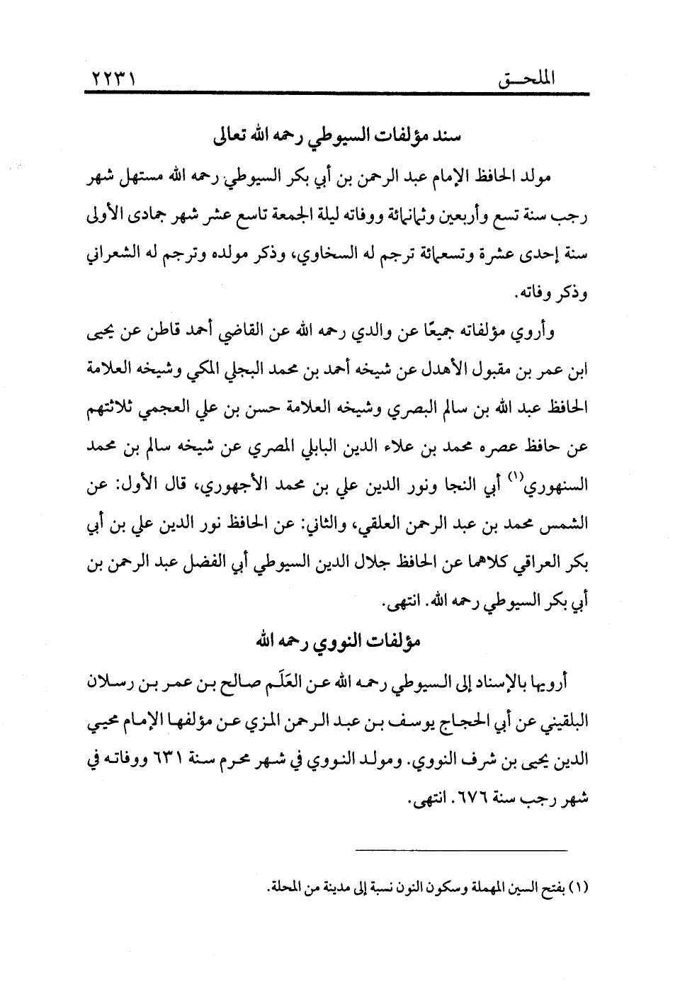 أرويها بالإسناد إلى السيوطي رحمه الله عن العلم صالح بن عمر بن رسلان البلقيني عن أبي الحجاج يوسف بن عبد الرحمن المزي عن مؤلفها الإمام محيي الدين يحيى بن شرف النووي ومولد النووي في شهر محرم سنة 631 ووفاته في شهر رجب سنة 674. انتهى.
