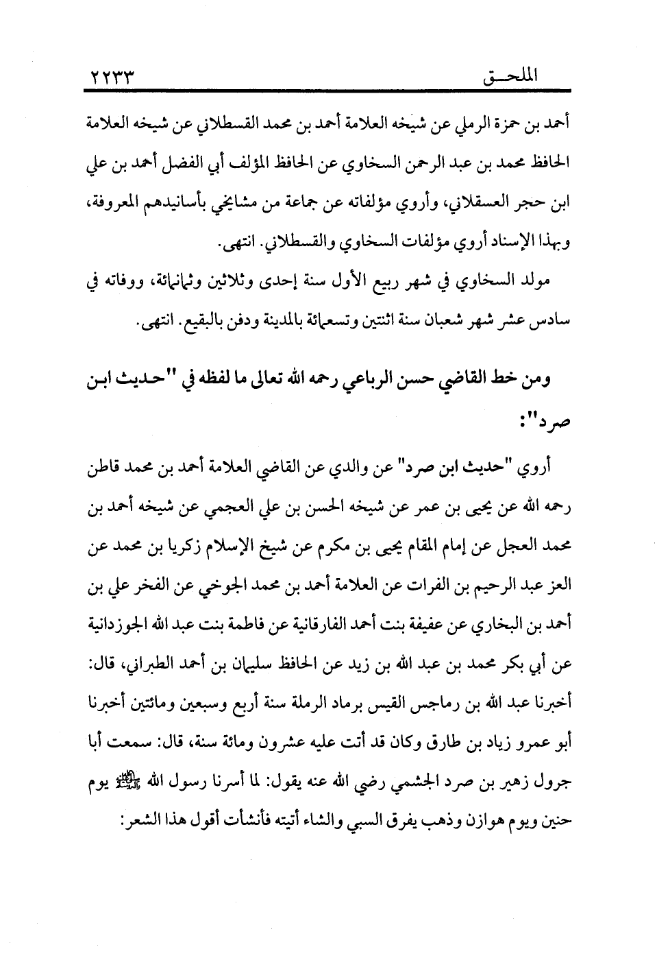 أحمد بن حمزة الرملي عن شيخه العلامة أحمد بن محمد القسطلاني عن شيخه العلامة الحافظ محمد بن عبد الرحمن السخاوي عن الحافظ المؤلف أبي الفضل أحمد بن علي بن حجر العسقلاني وأروي مؤلفاته عن جماعة من مشايخي بأسانيدهم المعروفة، وبهذا الإسناد أروي مؤلفات السخاوي والقسطلاني. انتهى.
