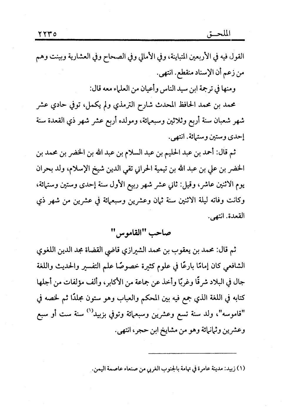 ثم قال: محمد بن يعقوب بن محمد الشيرازي قاضي القضاة مجد الدين اللغوي الشافعي كان إمامًا بارعًا في علوم كثيرة خصوصًا علم التفسير والحديث واللغة جال في البلاد شرقًا وغربًا وأخذ عن جماعة من الأكابر، وألف مؤلفات من أجلها كتابه في اللغة التي جمع فيه بين المحكم والعباب وهو ستون مجلدًا ثم لخصه في قاموسه، ولد سنة تسع وعشرين وسبعمائة وتوفي بزبيد (¬1) سنة ست أو سبع وعشرين وثمان مائة وهو من مشايخ ابن حجر، انتهى.