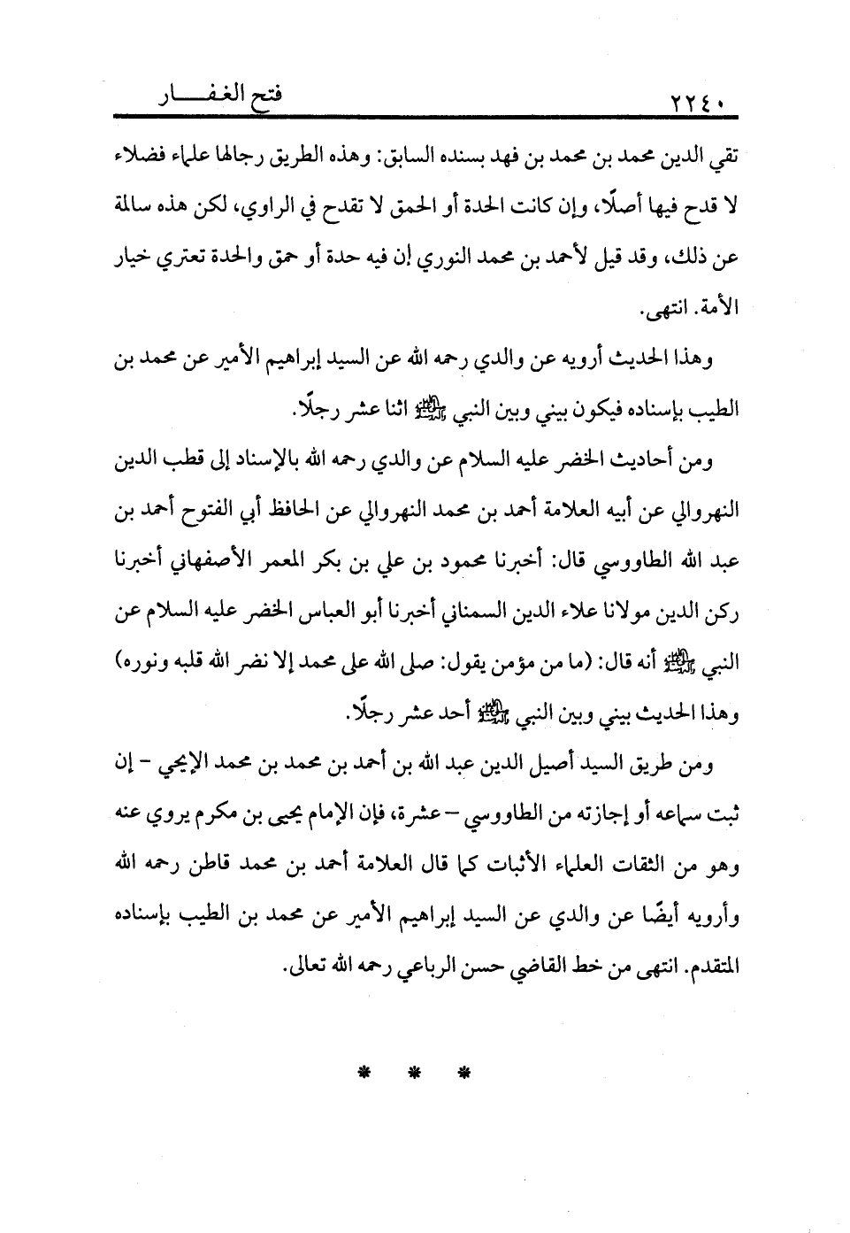 تقي الدين محمد بن محمد بن فهد بسنده السابق وهذه الطريق رجالها علماء فضلاء لا قدح فيها أصلًا، وإن كانت الحدة أو الحمق لا تقدح في الراوي، لكن هذه سالمة عن ذلك وقد قيل لأحمد بن محمد النوري أن فيه حدة أو حمق والحدة تعتري خيار الأمة. انتهى.