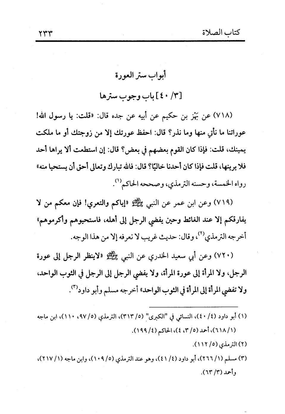 718 - عن بَهْز بن حكيم عن أبيه عن جده قال: «قلت: يا رسول الله! عوراتنا ما نأتي منها وما نذر؟ قال: احفظ عورتك إلا من زوجتك أو ما ملكت يمينك، قلت: فإذا كان القوم بعضهم في بعض؟ قال: إن استطعت ألا يراها أحد فلا يرينها، قلت فإذا كان أحدنا خاليًا؟ قال: فالله تبارك وتعالى أحق أن يستحيا منه» رواه الخمسة، وحسنه الترمذي، وصححه الحاكم (¬1) .