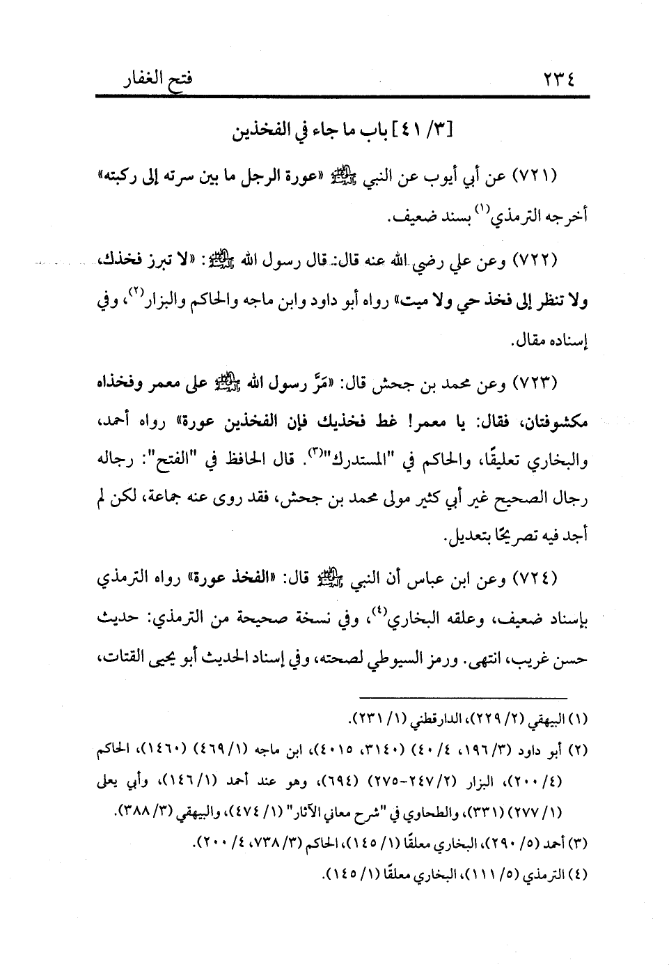 722 - وعن علي رضي الله عنه قال: قال رسول الله - صلى الله عليه وسلم -: «لا تبرز فخذك، ولا تنظر إلى فخذ حي ولا ميت» رواه أبو داود وابن ماجه والحاكم والبزار (¬2) ، وفي إسناده مقال.