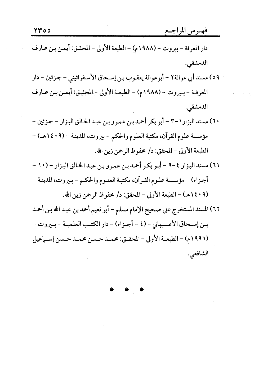 60) مسند البزار1-3 - أبو بكر أحمد بن عمرو بن عبد الخالق البزار - جزئين - مؤسسة علوم القرآن، مكتبة العلوم والحكم - بيروت، المدينة - (1409هـ) - الطبعة الأولى - المحقق: د/ محفوظ الرحمن زين الله.
