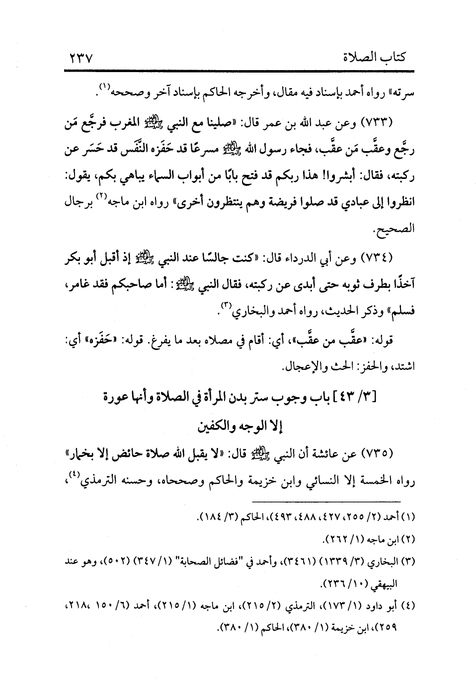 735 - عن عائشة أن النبي - صلى الله عليه وسلم - قال: «لا يقبل الله صلاة حائض إلا بخمار» رواه الخمسة إلا النسائي وابن خزيمة والحاكم وصححاه، وحسنه الترمذي