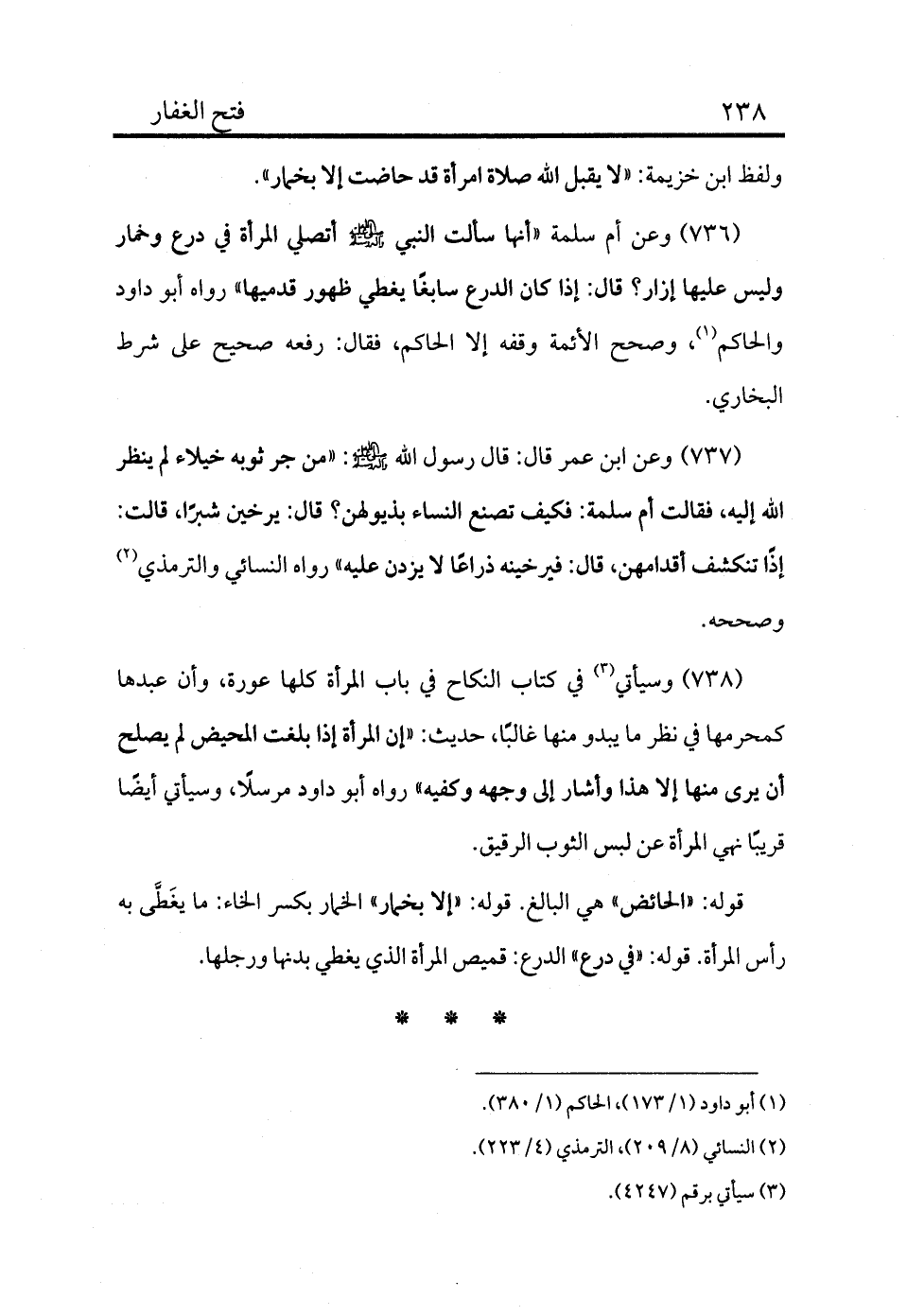 736 - وعن أم سلمة «أنها سألت النبي - صلى الله عليه وسلم - أتصلي المرأة في درع وخمار وليس عليها إزار؟ قال: إذا كان الدرع سابغًا يغطي ظهور قدميها» رواه أبو داود والحاكم (¬2) ، وصحح الأئمة وقفه إلا الحاكم، فقال: رفعه صحيح على شرط البخاري.