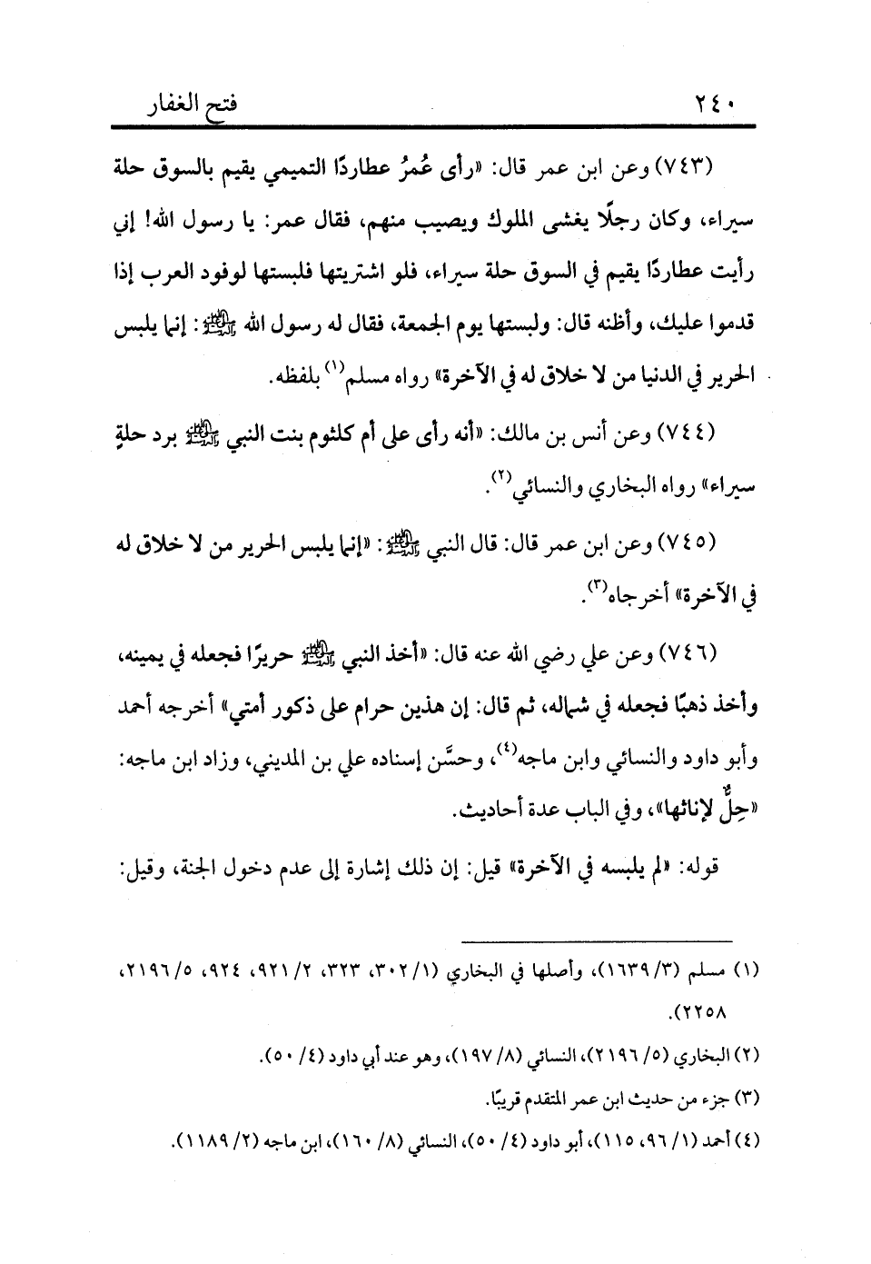 744 - وعن أنس بن مالك: «أنه رأى على أم كلثوم بنت النبي - صلى الله عليه وسلم - برد حلةٍ سيراء» رواه البخاري والنسائي (¬2) .