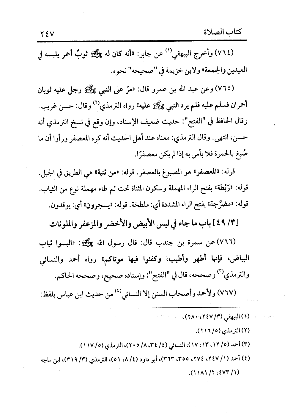 765 - وعن عبد الله بن عمرو قال: «مر على النبي - صلى الله عليه وسلم - رجل عليه ثوبان أحمران فسلم عليه فلم يرد النبي - صلى الله عليه وسلم - عليه» رواه الترمذي (¬2) وقال: حسن غريب، وقال الحافظ في "الفتح": حديث ضعيف الإسناد، وإن وقع في نسخ الترمذي أنه حسن، انتهى. وقال الترمذي: معناه عند أهل الحديث أنه كره المعصفر ورأوا أن ما صُبغ بالحمرة فلا بأس به إذا لم يكن معصفرًا.