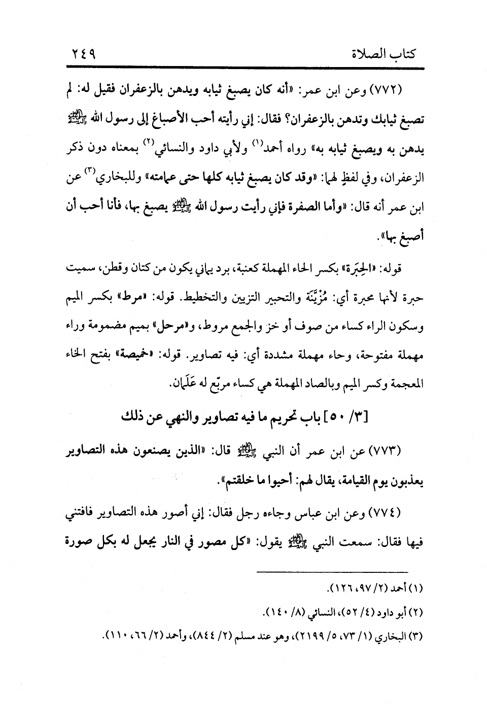 772 - وعن ابن عمر: «أنه كان يصبغ ثيابه ويدهن بالزعفران فقيل له: لم تصبغ ثيابك وتدهن بالزعفران؟ فقال: إني رأيته أحب الأصباغ إلى رسول الله - صلى الله عليه وسلم - يدهن به ويصبغ ثيابه به» رواه أحمد (¬1) ولأبي داود والنسائي (¬2) بمعناه دون ذكر الزعفران، وفي لفظٍ لهما: «وقد كان يصبغ ثيابه كلها حتى عمامته» وللبخاري (¬3) عن ابن عمر أنه قال: «وأما الصفرة فإني رأيت رسول الله - صلى الله عليه وسلم - يصبغ بها، فأنا أحب أن أصبغ بها» .