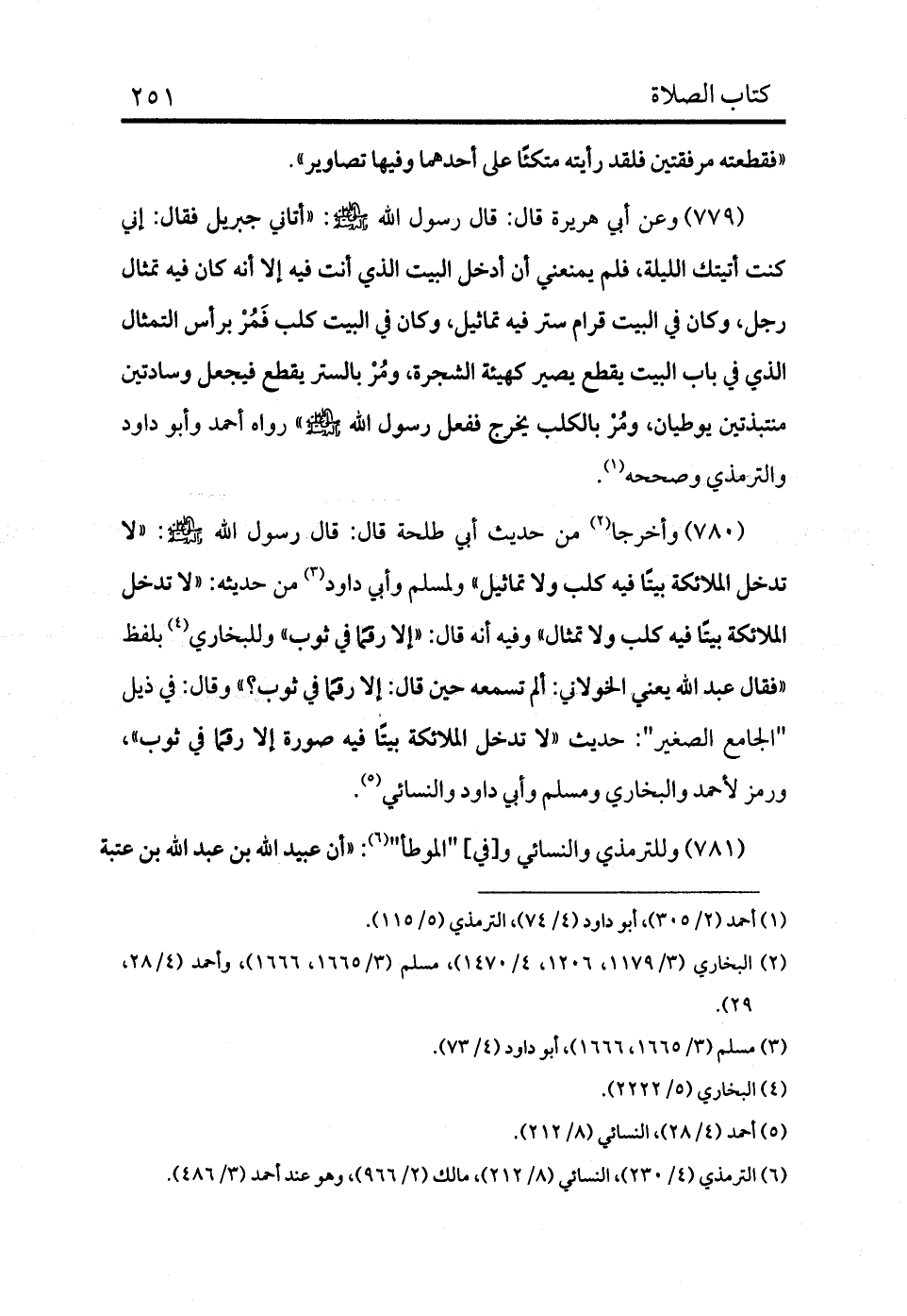 780 - وأخرجا (¬2) من حديث أبي طلحة قال: قال رسول الله - صلى الله عليه وسلم -: «لا تدخل الملائكة بيتًا فيه كلب ولا تماثيل» ولمسلم وأبي داود (¬3) من حديثه: «لا تدخل الملائكة بيتًا فيه كلب ولا تمثال» وفيه أنه قال: «إلا رقمًا في ثوب» وللبخاري (¬4) بلفظ «فقال عبد الله يعني الخولاني: ألم تسمعه حين قال: إلا رقمًا في ثوب؟» وقال: في ذيل "الجامع الصغير": حديث «لا تدخل الملائكة بيتًا فيه صورة إلا رقمًا في ثوب» ، ورمز لأحمد والبخاري ومسلم وأبو داود والنسائي (¬5) .