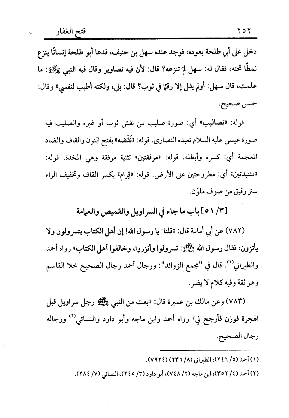 782 - عن أبي أمامة قال: «قلنا: يا رسول الله! إن أهل الكتاب يتسرولون ولا يأتزون، فقال رسول الله - صلى الله عليه وسلم -: تسرولوا وأتزروا، وخالفوا أهل الكتاب» رواه أحمد والطبراني (¬1) . قال في "مجمع الزوائد": ورجال أحمد رجال الصحيح خلا القاسم هو ثقة وفيه كلام لا يضر.