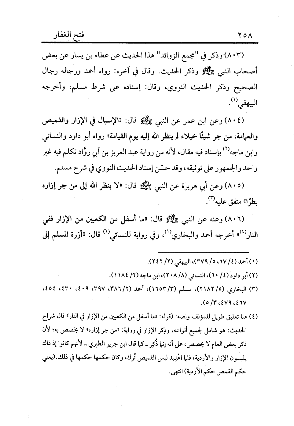 (¬4) قوله: «ما أسفل من الكعبين من الإزار في النار» قال شراح الحديث: هو شامل لجميع أنواعه، وذلك الإزار في رواية: «من جر إزاره» لا يخصص به؛ لأن ذكر بعض العام لا يخصص، على أنه إنما ذكر كما قال ابن جرير الطبري؛ لأنهم كانوا إذ ذاك يلبسون الإزار، فلما اعُتيد لبس القميص تُرك، وكان حكمها حكمها في ذلك. انتهى. =
