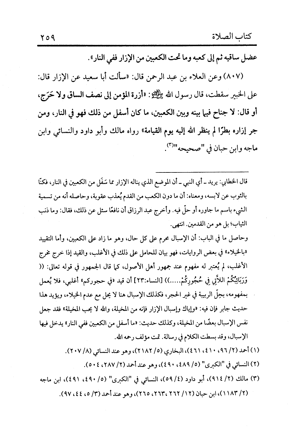 807 - وعن العلاء بن عبد الرحمن قال: «سألت أبا سعيد عن الإزار قال: على الخبير سقطت، قال رسول الله - صلى الله عليه وسلم -: «أزرة المؤمن إلى نصف الساق ولا حَرَج، أو قال: لا جناح فيما بينه وبين الكعبين، ما كان أسفل من ذلك فهو في النار، ومن جر إزاره بطرًا لم ينظر الله إليه يوم القيامة» رواه مالك وأبو داود والنسائي وابن ماجه وابن حبان في "صحيحه" (¬1) .