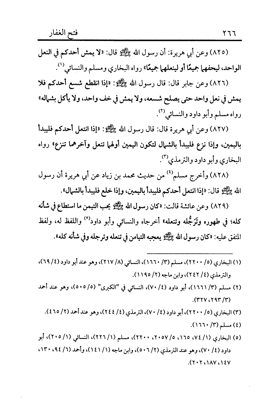 827 - وعن أبي هريرة قال: قال رسول الله - صلى الله عليه وسلم -: «إذا انتعل أحدكم فليبدأ باليمين، وإذا نزع فليبدأ بالشمال لتكون اليمين أولهما تنعل وآخرهما تنزع» رواه البخاري وأبو داود والترمذي (¬3) .
