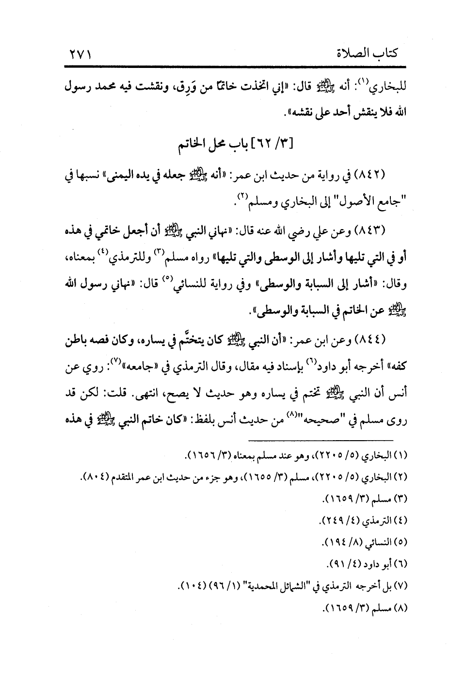 843 - وعن علي رضي الله عنه قال: «نهانا النبي - صلى الله عليه وسلم - أن أجعل خاتمي في هذه أو في التي تليها وأشار إلى الوسطى والتي تليها» رواه مسلم (¬3) وللترمذي (¬4) بمعناه، وقال: «أشار إلى السبابة والوسطى» وفي رواية للنسائي (¬5) قال: «نهاني رسول الله - صلى الله عليه وسلم - عن الخاتم في السبابة والوسطى» .