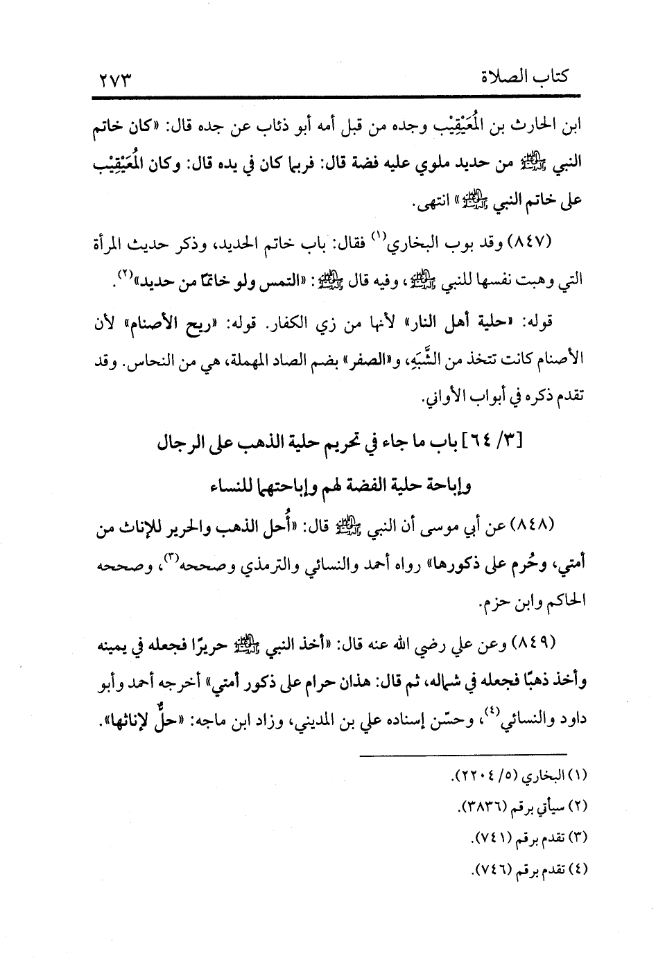 848 - عن أبي موسى أن النبي - صلى الله عليه وسلم - قال: «أُحل الذهب والحرير للإناث من أمتي، وحرم على ذكورها» رواه أحمد والنسائي والترمذي (¬3) وصححه الحاكم وابن حزم.