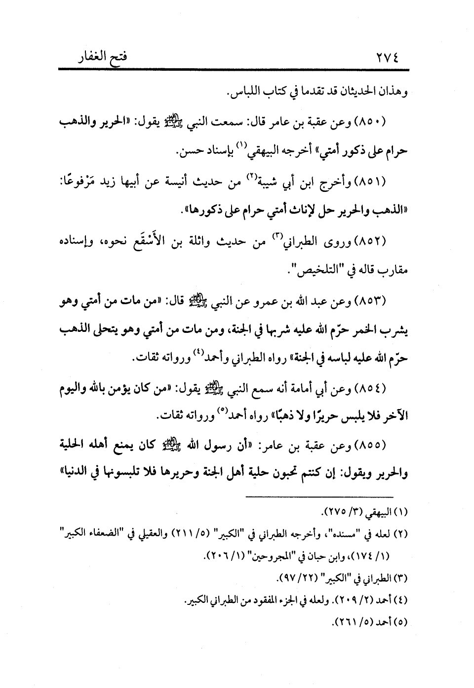 854 - وعن أبي أمامة أنه سمع النبي - صلى الله عليه وسلم - يقول: «من كان يؤمن بالله واليوم الآخر فلا يلبس حريرًا ولا ذهبًا» رواه أحمد (¬5) ورواته ثقات.