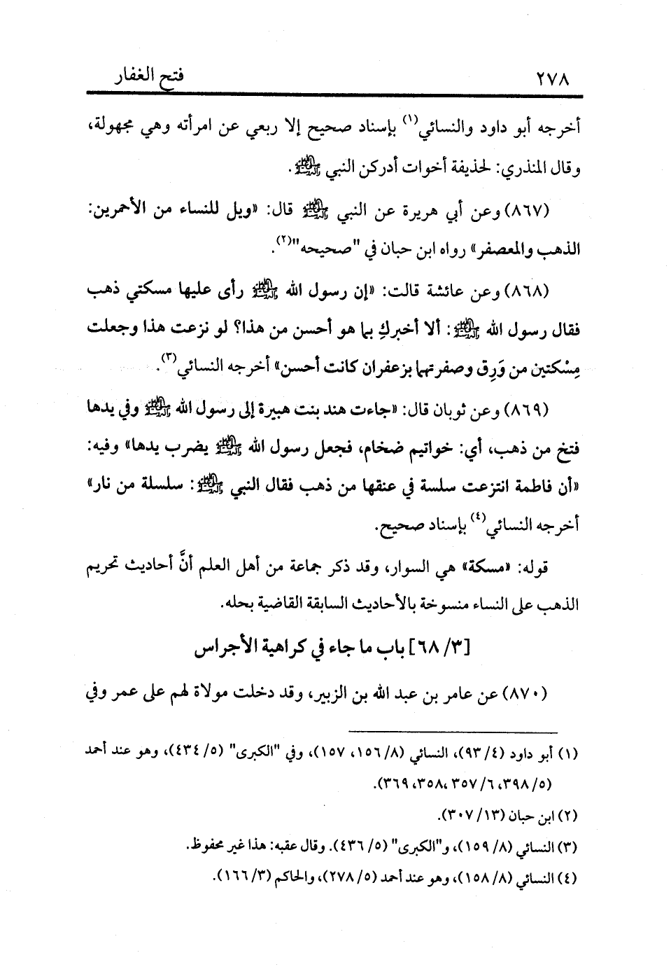 867 - وعن أبي هريرة عن النبي - صلى الله عليه وسلم - قال: «ويل للنساء من الأحمرين: الذهب والمعصفر» رواه ابن حبان في "صحيحه" (¬2) .