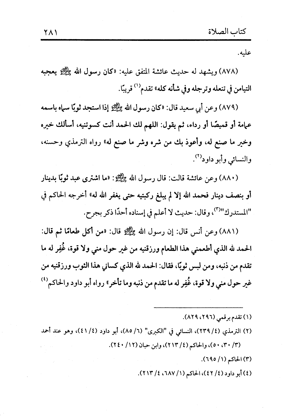 881 - وعن أنس أن رسول الله - صلى الله عليه وسلم - قال: «من أكل طعامًا ثم قال: الحمد لله الذي أطعمني هذا الطعام ورزقنيه من غير حول مني ولا قوة غفر الله له ما تقدم من ذنبه، ومن لبس ثوبًا، فقال: الحمد لله الذي كساني هذا الثوب ورزقنيه من غير حول مني ولا قوة غفر له ما تقدم من ذنبه وما تأخر» رواه أبو داود والحاكم (¬4)