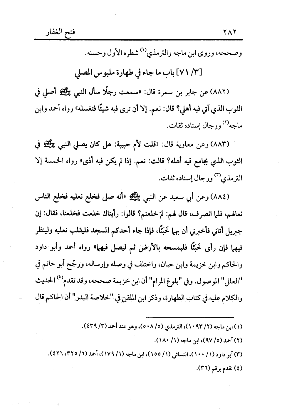 882 - عن جابر بن سمرة قال: «سمعت رجلًا سأل النبي - صلى الله عليه وسلم - أصلي في الثوب الذي آتي فيه أهلي؟ قال: نعم. إلا أن ترى فيه شيئًا فتغسله» رواه أحمد وابن ماجه (¬2) ورجال إسناده ثقات.