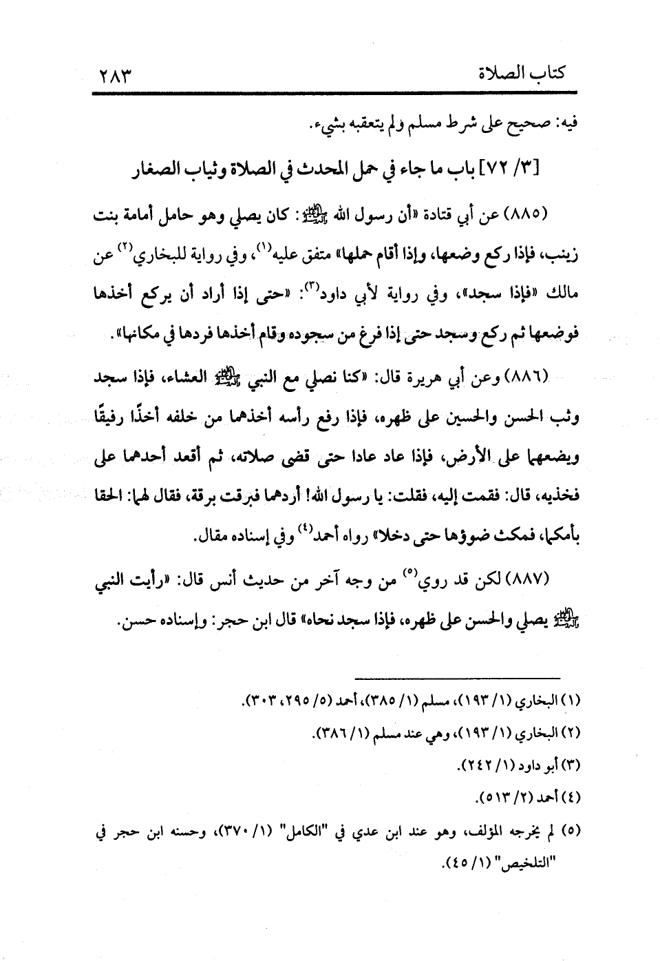 887 - لكن قد روي (¬5) من وجه آخر من حديث أنس قال: «رأيت النبي - صلى الله عليه وسلم - يصلي والحسن على ظهره، فإذا سجد نحاه» قال ابن حجر: وإسناده حسن.