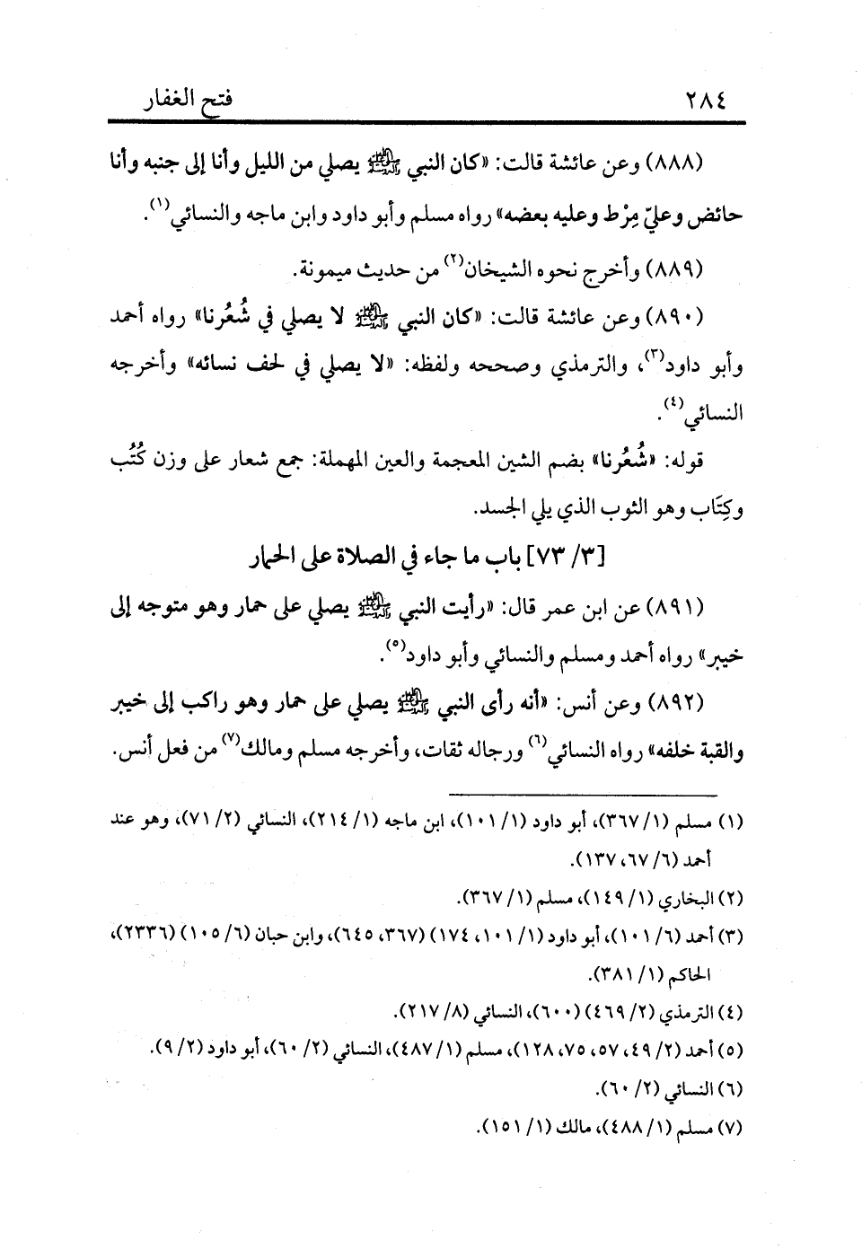 890 - وعن عائشة قالت: «كان النبي - صلى الله عليه وسلم - لا يصلي في شُعُرنا» رواه أحمد وأبو داود (¬3) ، والترمذي وصححه ولفظه: «لا يصلي في لحف نسائه» وأخرجه النسائي (¬4) .