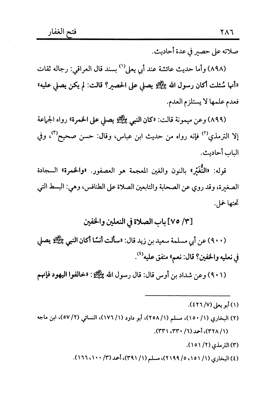 900 - عن أبي مسلمة سعيد بن زيد قال: «سألت أنسًا أكان النبي - صلى الله عليه وسلم - يصلي في نعليه والخفين؟ قال: نعم» متفق عليه (¬4) .