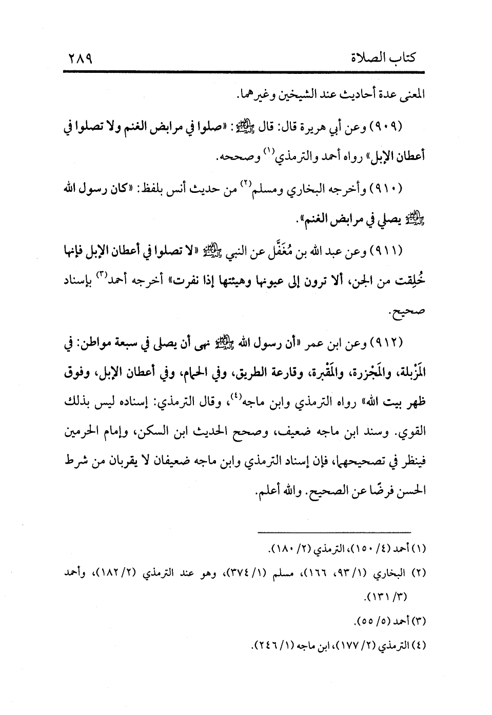 909 - وعن أبي هريرة قال: قال - صلى الله عليه وسلم -: «صلوا في مرابض الغنم ولا تصلوا في أعطان الإبل» رواه أحمد والترمذي (¬1) وصححه.