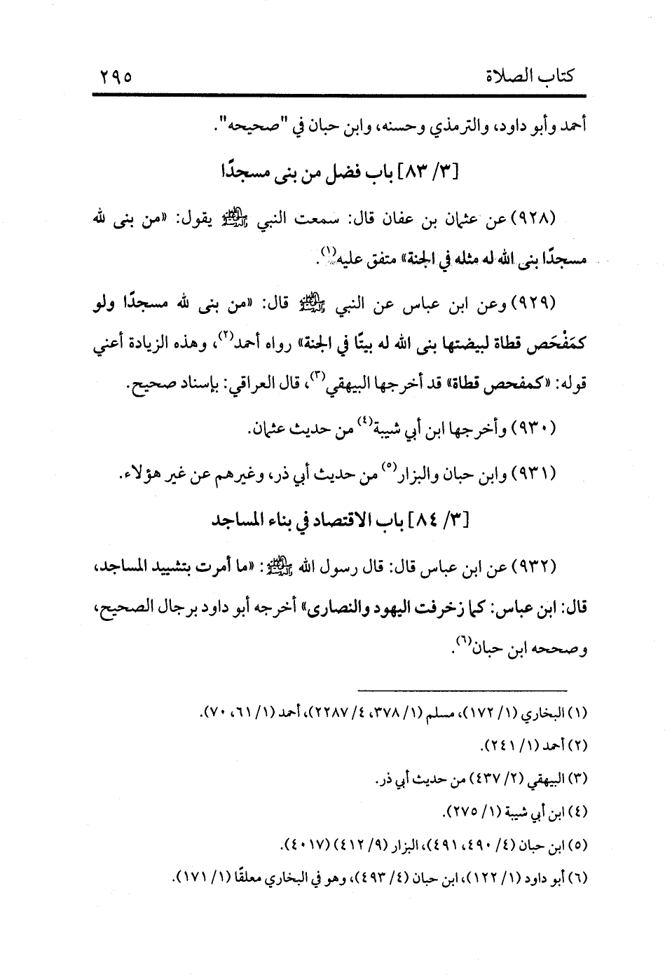 932 - عن ابن عباس قال: قال رسول الله - صلى الله عليه وسلم -: «ما أمرت بتشييد المساجد، قال: ابن عباس: كما زخرفت اليهود والنصارى» أخرجه أبو داود برجال الصحيح، وصححه ابن حبان (¬6) .