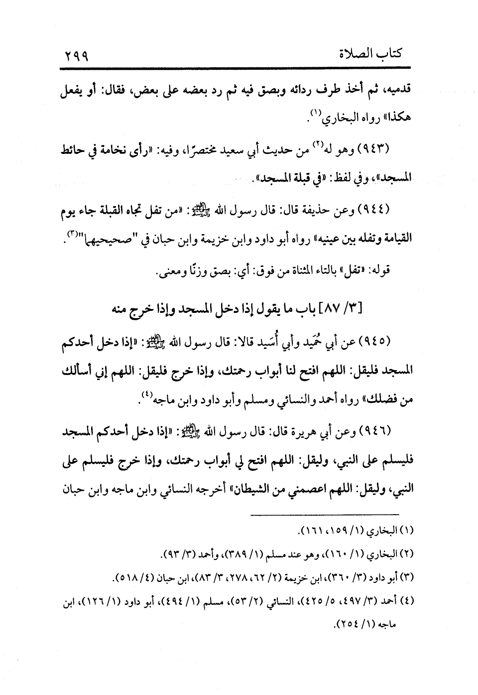 945 - عن أبي حُمَيد وأبي أُسَيد قالا: قال رسول الله - صلى الله عليه وسلم -: «إذا دخل أحدكم المسجد فليقل: اللهم افتح لنا أبواب رحمتك، وإذا خرج فليقل: اللهم إني أسألك من فضلك» رواه أحمد والنسائي ومسلم وأبو داود وابن ماجه (¬4) .